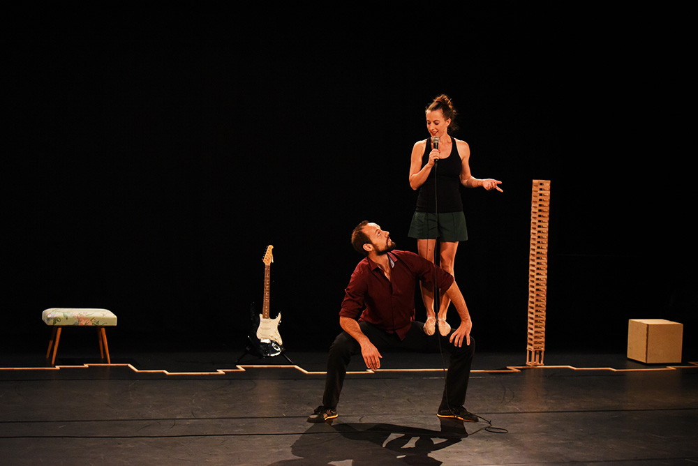 另一个以语言为实验主体的是比利时的双人组克里斯与伊莉丝(Chris & Iris)的新作《呈现》(V_RST_LL_NG)。演出以文字、物件与身体的交织为基底,默契十足的搭档,以诚实的口吻谈论巡演生活、训练的枯燥与身体磨耗,并以幽默化解其中的疲惫。重复的动作被拆解并重新排列,语言在手掌、肩膀、抛接的力道间被折射成新的含义。这种将「话语」转化为肢体行为的策略,除了技术展示,更关乎两人关系「如何理解彼此」的过程。