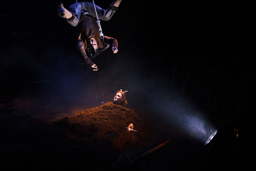 相较之下,芬兰西苏斯马戏团( SISUS) 的《泥土的记忆》(Memoirs of Mud)则是一种温柔的渗透。两位女性表演者像是从土壤中长出的作物,又同时是灌溉的农夫,只是她们浇灌的不是谷物,而是「庞克农场」的时尚。满地泥泞成了她们的伸展台,手提包幻化为温室,马铃薯被加冕为王冠,怪异的造型与行动,充满混沌和脏乱,泥巴沾满双手,指缝留下痕迹,挑战女性角色的温柔规训。全场没有语言,只有泥土与身体的翻滚、挣扎与纠缠,在肮脏与荒谬中,从母性大地获得力量,开出诗意与纯真的怪奇花朵。