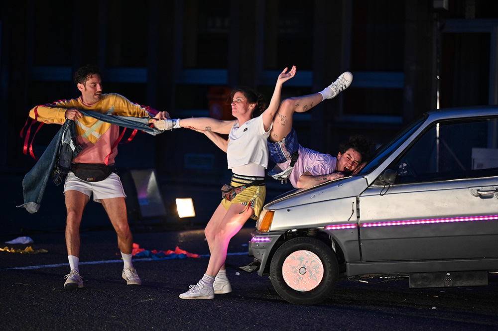 法国「小小点子保护协会」( Société Protectrice de Petites Idées) 的《重机混乱》 (Heavy Motors)更是彻底拥抱失败。1辆充满机关的破旧二手车,3位身穿霓虹运动服、腰系亮片腰包,带著韵律彩带的表演者,将舞台变成一场荒诞车展。看他们如何「出错」,是推动整场演出的动力——车轮歪斜打滑卡顿,身体被车门夹住拖行,令人尴尬的飞跃彩带舞。技巧高超之处不在于避开错误,而在于如何让错误变得令人著迷。它把俗丽与混乱推向极致,疯狂且真挚地邀请观众一起坠入失序,找到自由。