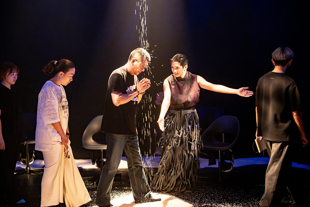 当观众脱鞋、存放随身物件、穿上黑袜,并在纸片上签名、握住一把米、饮下通宁水时,整个入口仪式(ritual)就已经运转起来,观众由「外界」切换至「仪式场域」内,其身体从观看者转为参与者。身体放下日常的厚重标识——鞋袜、包袋、身分象征——以极简行动(签名、握米、饮液)作为进场契机,从而提醒:今天你将被邀请进入叙事、身体与记忆的复合体。