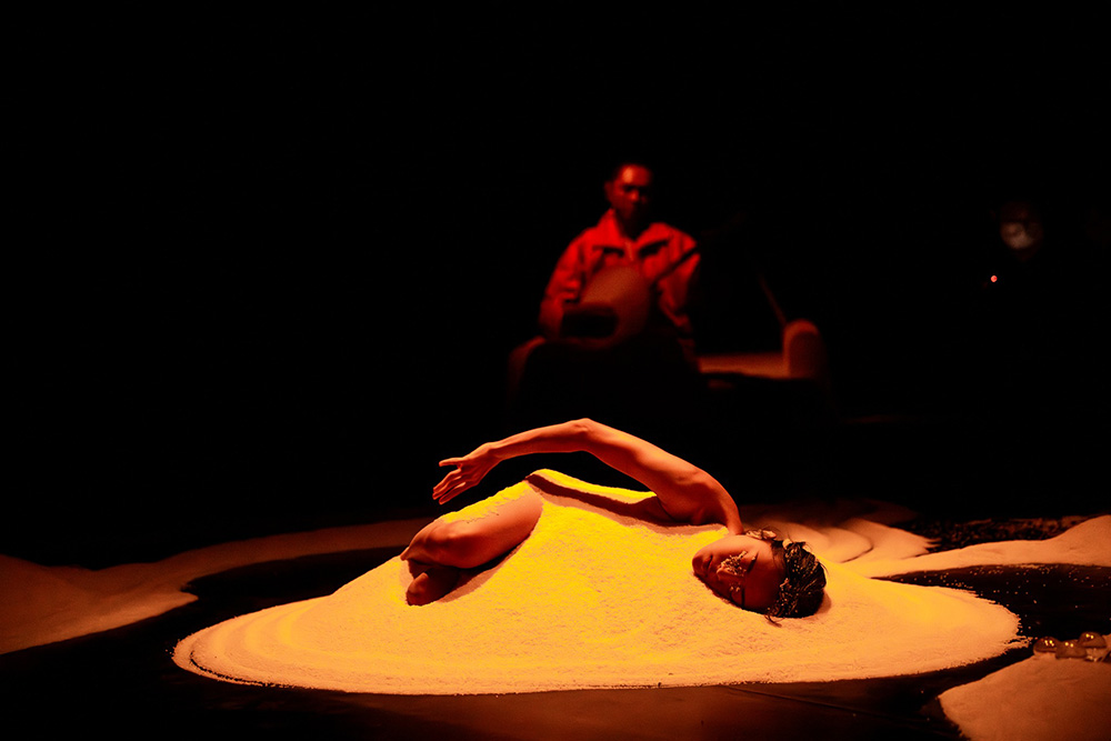 舞者从米堆中缓缓起身,动作似乎带有复苏或苏醒性质,当舞者转腿、将米泼撒至观众身上,米粒在观众与空间之间生成微小扰动:彼此瞬间改变观者与舞台之间的关系,米粒飞散成为介质,此刻,观者的身体被直接触及(米散落于观者处),使观众从「观看者」转为「被观看/被触及者」,从而打破传统剧场里单向关系。