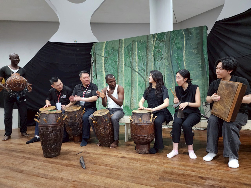 这趟旅程中,他们参与3场深刻且充满温度的交流活动。第一场便是在迦纳国家剧院。当地的管弦乐团并不演奏古典曲目,而是以原创作品为主,并融入充满特色的非洲鼓乐。朱团在准备交流讲座时,也思考「什么最能代表我们」。他们带去了具有东方色彩与金属音响的乐器,在当地多为皮革鼓类的情况下,最容易携带、又能彰显文化差异的,正是朱团的传统锣鼓。