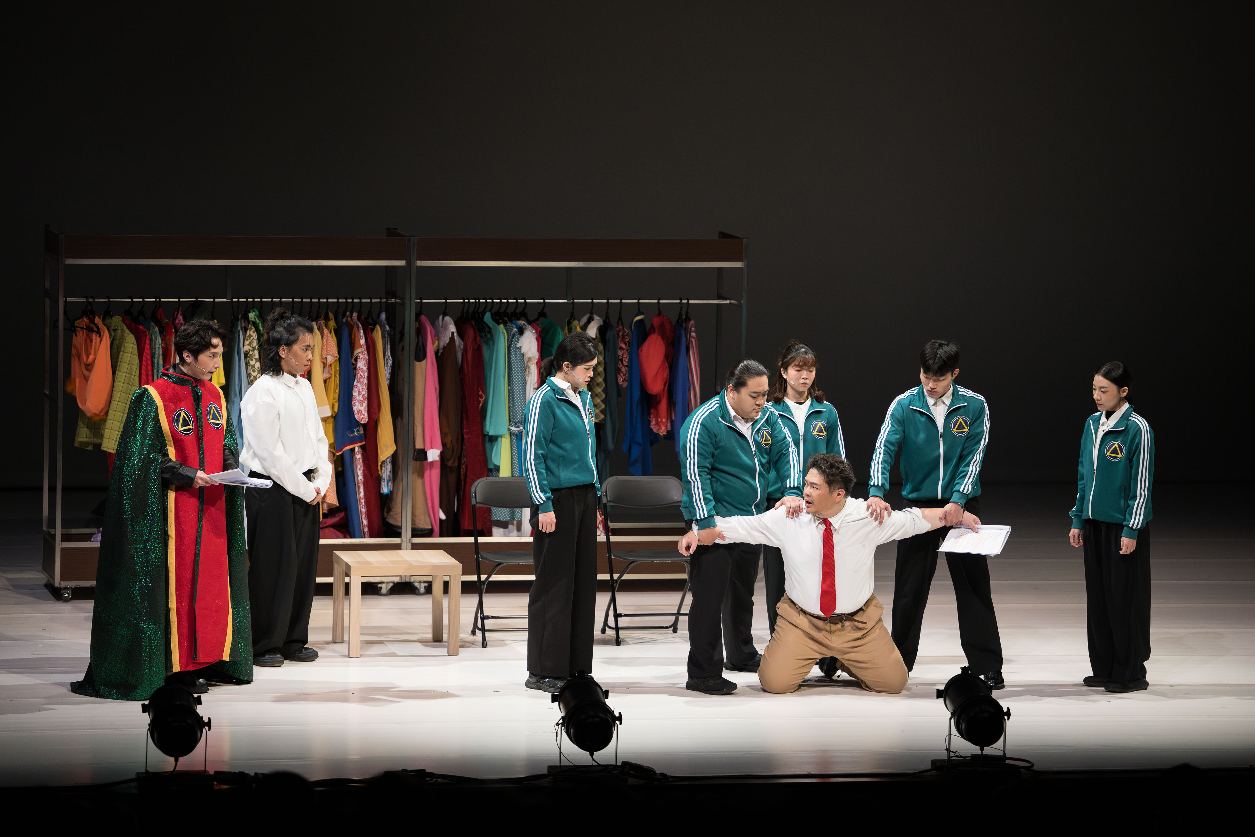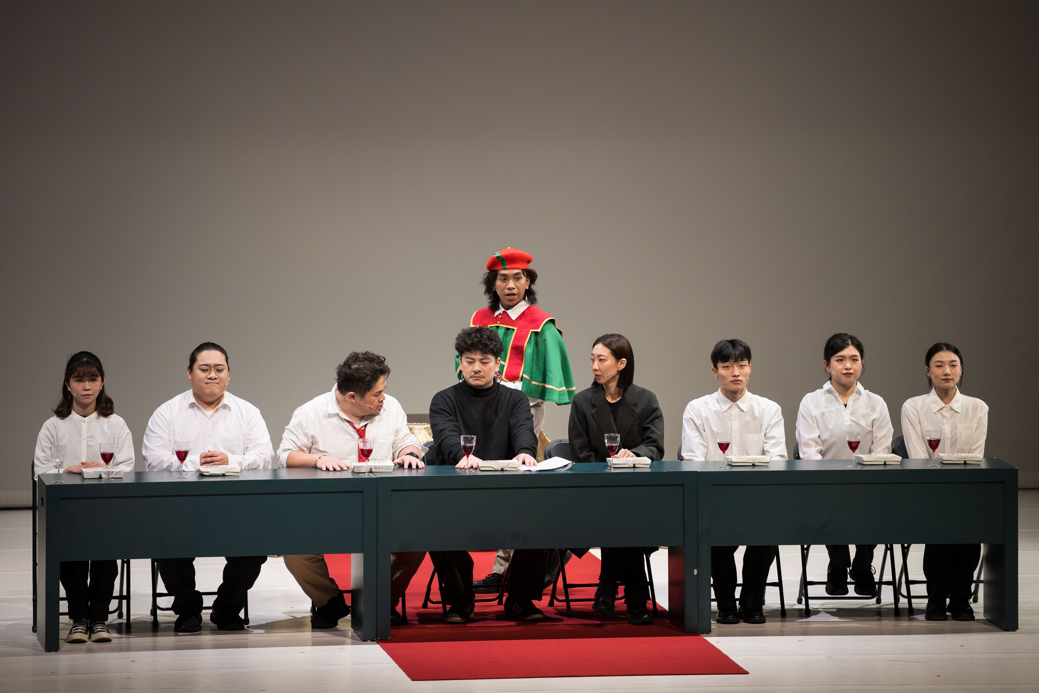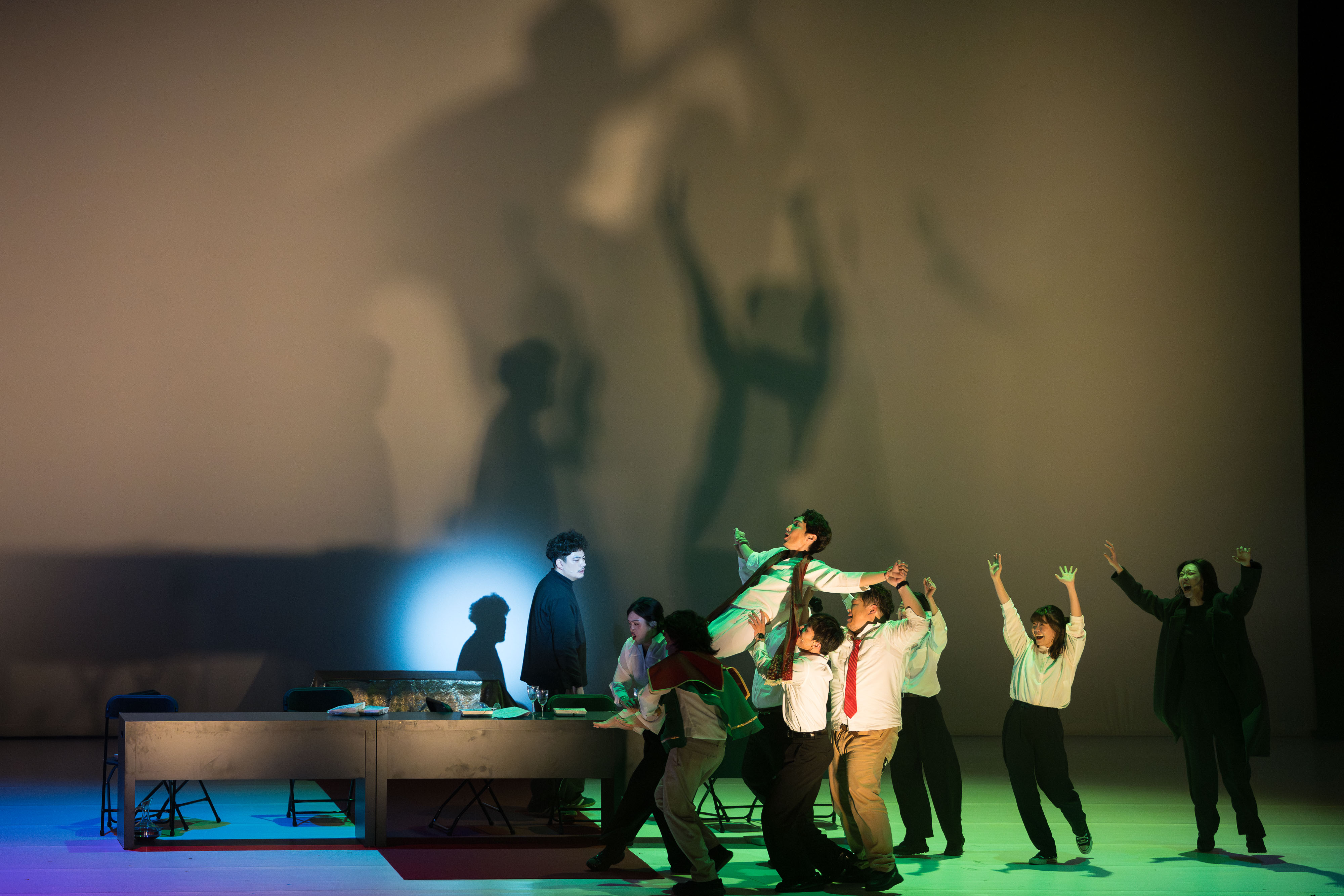在视觉设计上,服装造型从宗教领袖的关键套装,延伸至信徒的日常背心与运动外套,整体以绿色与红色系为主调,营造出一种既有一体感却又带有荒诞趣味的视觉张力。灯光与音效设计则紧扣剧情发展,聚焦于角色的内在冲突与张力。现场气氛热烈,观众在即时投影与舞台表演的交错中,体验了一场信仰失控的荒诞洗礼。