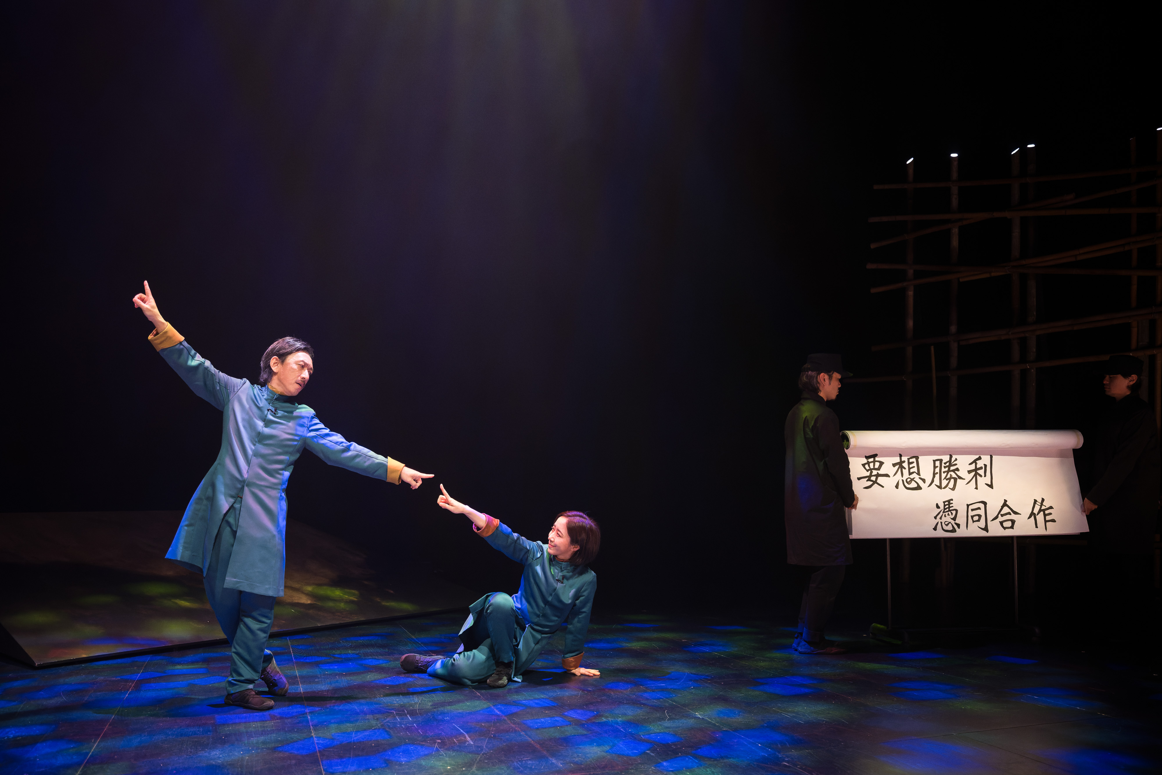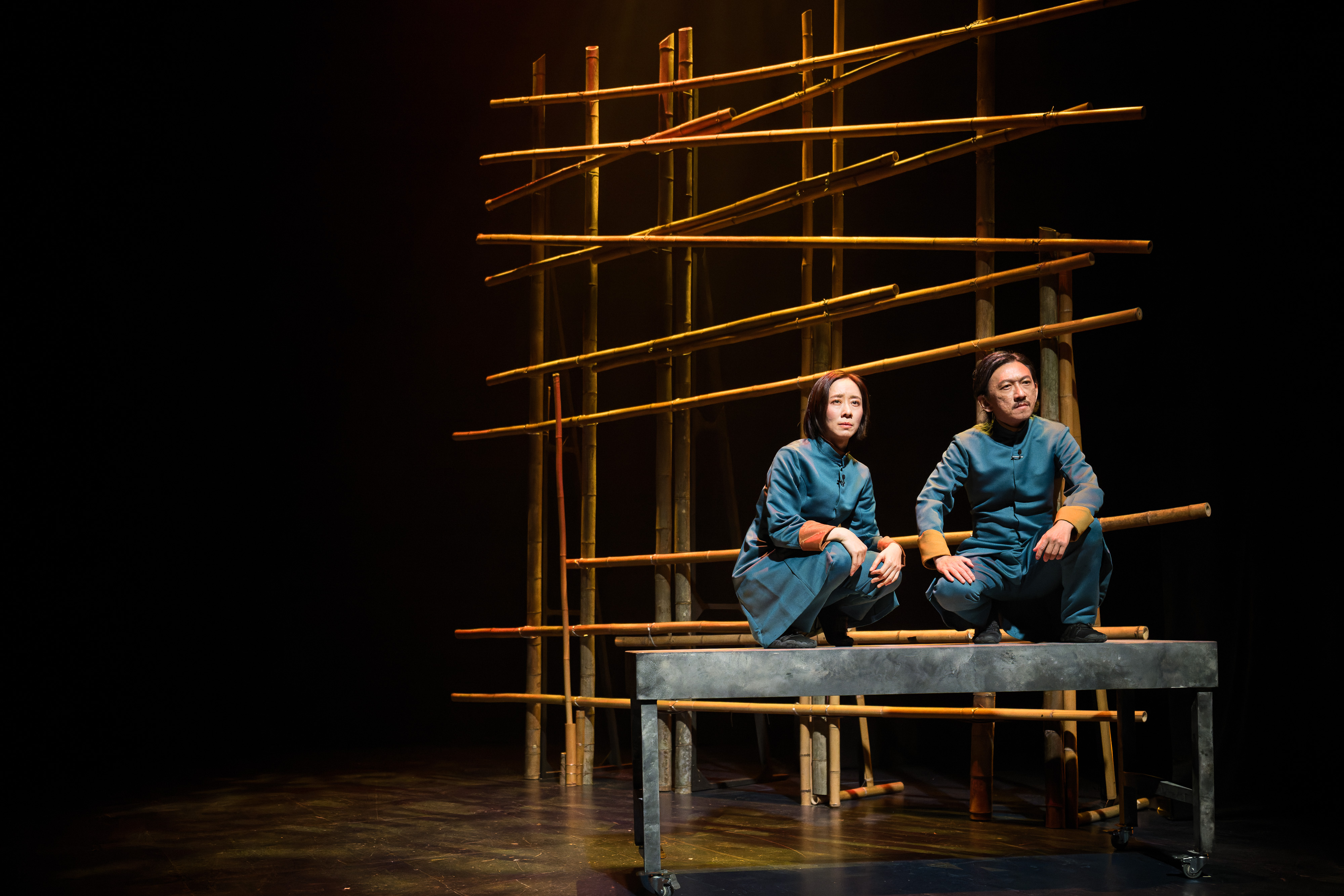于北艺中心演出的新版《暗夜.腹语.鬼托邦》,在剧情与舞台上皆有调整。作品最后段落新增剧中马共游击队角色「明哥」的来信,信中表达希望能在台湾与阿梅重逢,叙事不只停留于记忆与召唤,更指向跨越时空的未竟相见,为结局增添历史重量与情感开口。同时,因应现地条件,舞台设计亦作出转化——原先悬置空中、象征新村记忆与漂浮历史的竹构装置,改为落地呈现,使「新村」从幽灵般的想像降临为可触的现实,强化历史落回当下身体经验的命题。