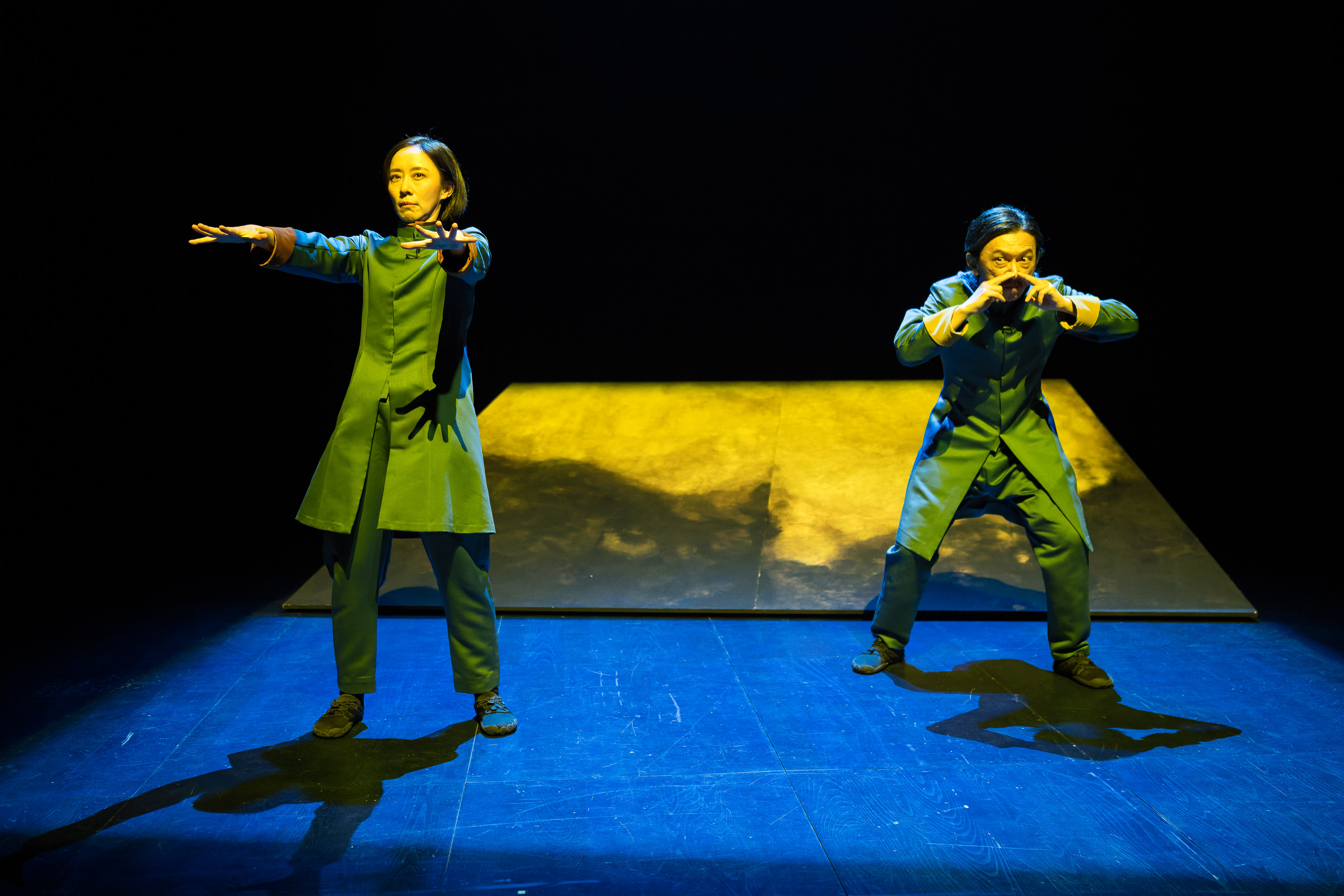 表演形式上,高俊耀与郑尹真以「一人多角」甚至「双人共角」的方式演出,演员身体成为语言的容器,各种身分穿梭其间,两人亦借鉴传统戏曲以声音推动身体的表演逻辑,透过节奏与时间流速的调整,形成轻重交错、复声叠影的舞台质感。郑尹真也表示相较过去多半缓慢进入角色,这出戏需要喜剧的快节奏,在形体、声音、语言的转换节奏上,都经过反复的打磨。