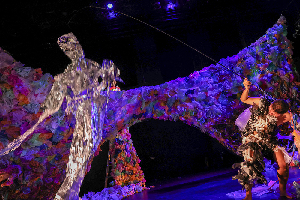最後,令人驚喜的是,《最後的隧道》中融入了偶戲的元素:舞者以釣竿操縱一不規則的紙片,使其翩翩飛浮、盤旋於舞台與觀眾席上空。加上恰到好處的燈光與紙片本身的反光材質特性,這個銀閃閃的飛行物如同幻覺、鬼魂或有其他種可能性的靈體,在舞者們的追逐、抓取與撕扯間,以一個其實極為虛幻和脆弱的姿態,操控了這群生物,主導了他們意圖,使人聯想到人生在世,那些浮華虛妄的慾念和幻望,是如何控制了我們自身,揭示人類即便自視文明、先進的生物,仍逃不脫那原始的命運。