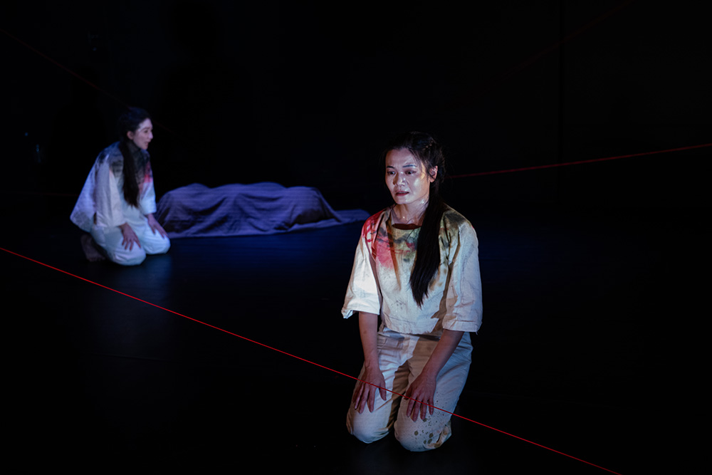 帶著這個理念,在身聲的創作中不斷被驗證。2025年從《落頭氏》到新作《眾神的國籍》,兩個作品皆是發想自莊惠勻,她試著讓身體與歷史共振,與夥伴們一起思考最終大家會走向那裡。前者以東南亞傳說為引,探問華人文化的流動與認同;後者則從「日本人在台灣成為神」的神話故事出發,延伸至滿洲國邊界的想像——在那裡,人與鬼、神與國籍、殖民與被殖民的界線全部模糊。