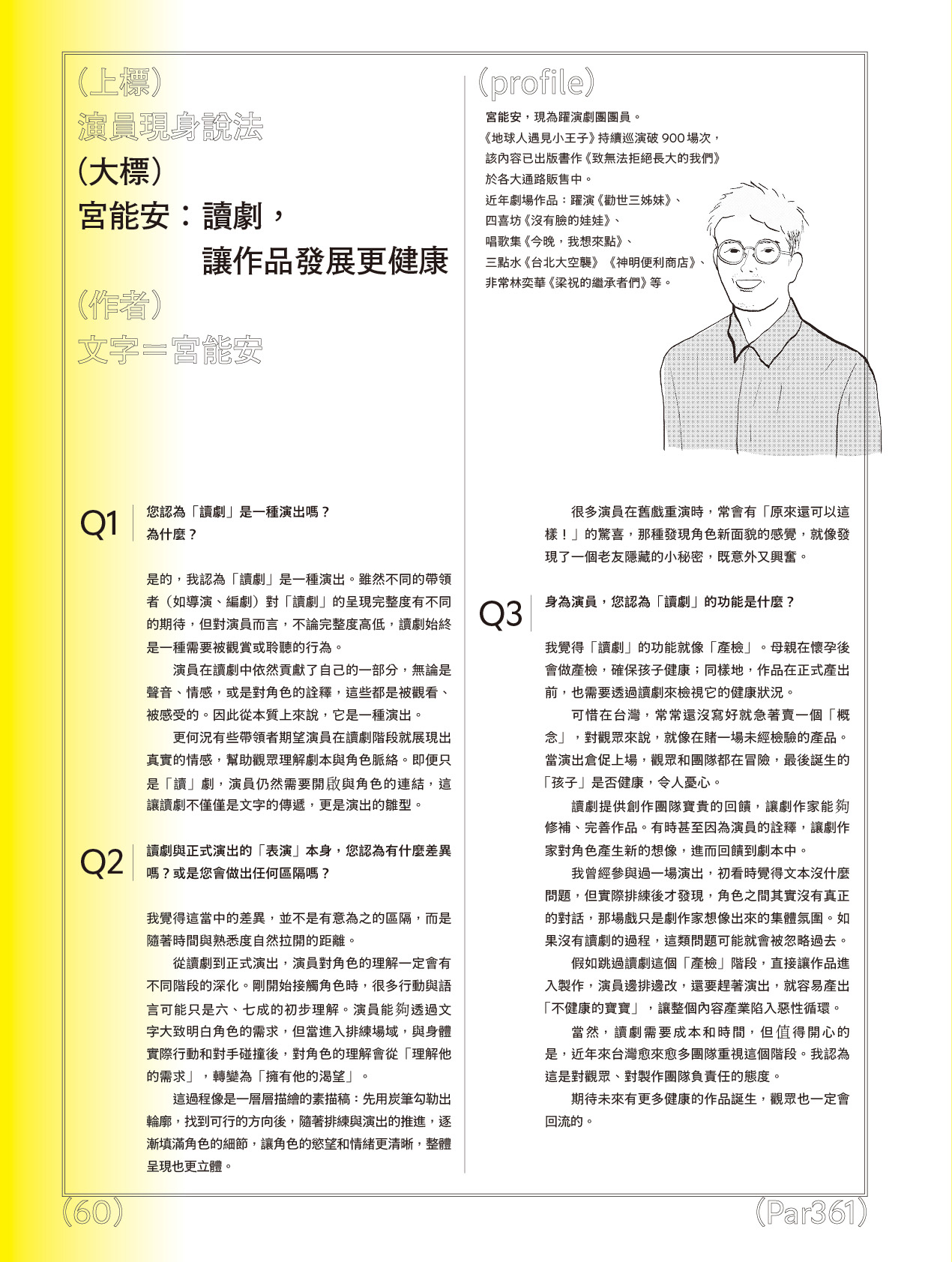 我覺得「讀劇」的功能就像「產檢」。母親在懷孕後會做產檢,確保孩子健康;同樣地,作品在正式產出前,也需要透過讀劇來檢視它的健康狀況。