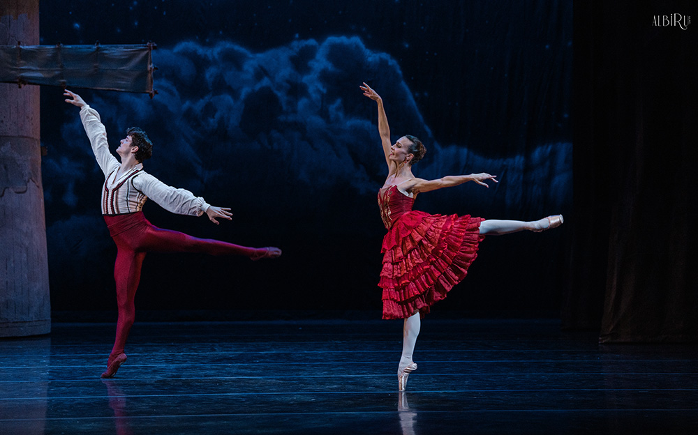 在舞蹈風格上,Martínez將嚴謹細膩的古典芭蕾技巧,與熱烈奔放的佛朗明哥精神巧妙融合。從手腕、指尖到腳步節奏的細節設計,都可見西班牙民族舞蹈的影子,使作品在華麗炫技之外,更具文化辨識度與情感溫度。舞台美學亦呼應西班牙風土色彩,透過鮮明明亮的色調與層次豐富的群舞場面,營造出節慶般的熱情氛圍。